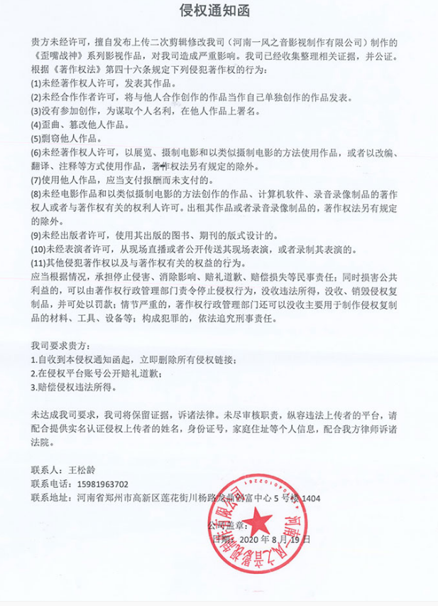 不管管云鹏自己入驻B站,就惹得他背后的影视公司一风之音不高兴了,因为管云鹏赚钱了,一风之音可没赚钱。所以一风之音仗着自己有歪嘴战神的版权,所以直接对B战律师函警告。而且不只是要求删除龙王赘婿这系列视频,而且即使是UP主们自己创作的视频,也是被要求删除并且道歉。